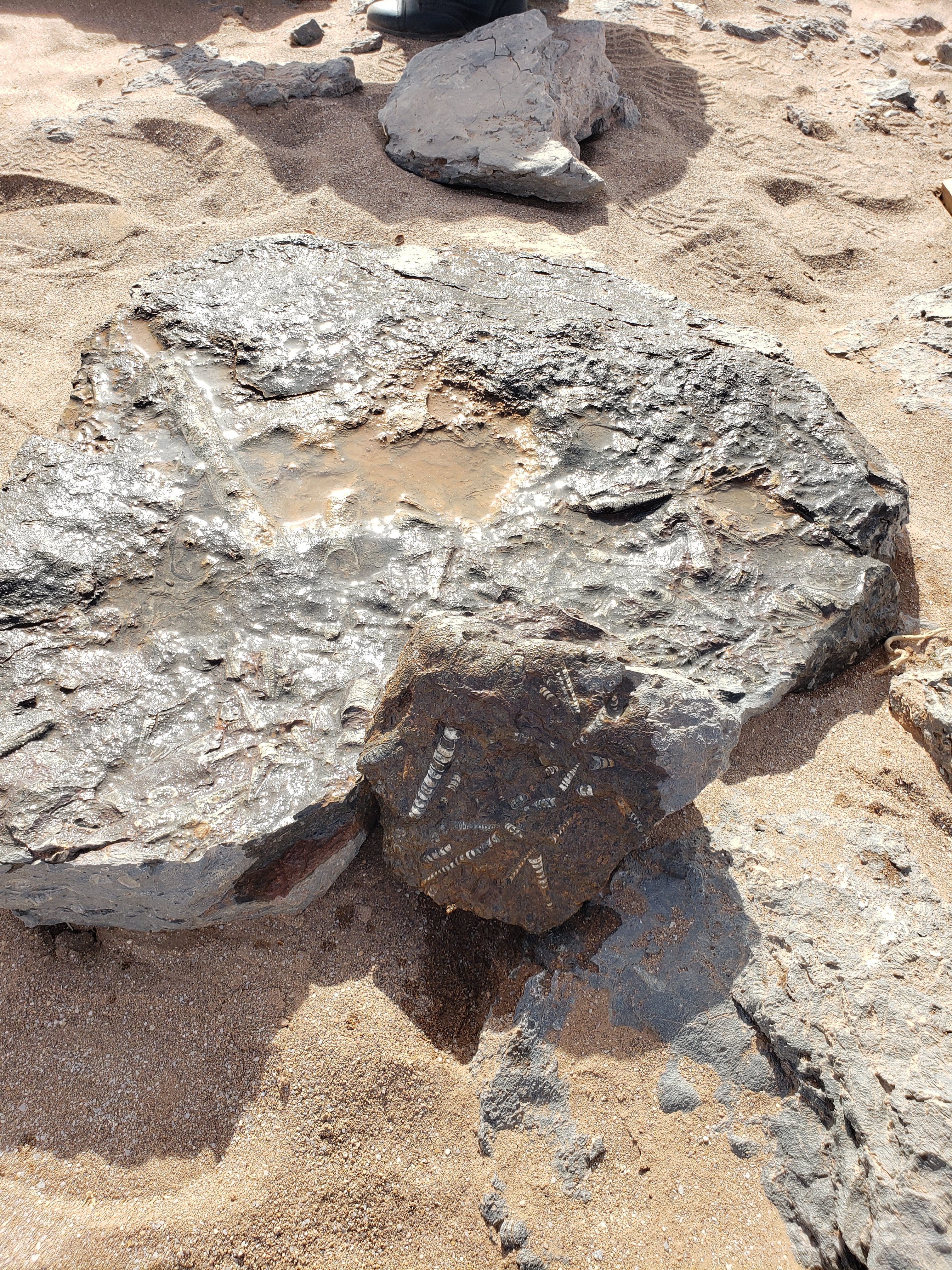 Our next stop was to pick up some sandwiches and skewers before we hit the desert, the last town shown on the map – M’Hamid. Before we left, Ali asked us if we wanted to get a Moroccan turban advising it would be really beneficial while we were in the desert. He brought us to a local show to get fitted. I don’t think Rainier and I would have done this on our own. We weren’t sure if it was really appropriate or a sign of disrespect, but Ali emphasized that it’s not like that. It was one of my favorite experiences looking back on Morocco. As we left the town behind, Ali took us to a real ‘Oasis’! Rainier was in awe as he set up a picnic for us to eat our lunch under the palm trees with roaming camels around us. It was such a cool place to eat our lunch. As we packed up, we knew that the next two hours were going to be desert terrain. After an hour or so, Ali asked if we wanted to see some fossils! Of course we said Yes and he just pulls over, in the middle of the dessert, and points to a rock. Low and behold, we were standing in the middle of a preexisting lake. It even showed the lake on the map! Over the years it had completely dried up and we were able to make out fossils in the rocks all around us. It was incredible just casually driving along and stopping by to see this.