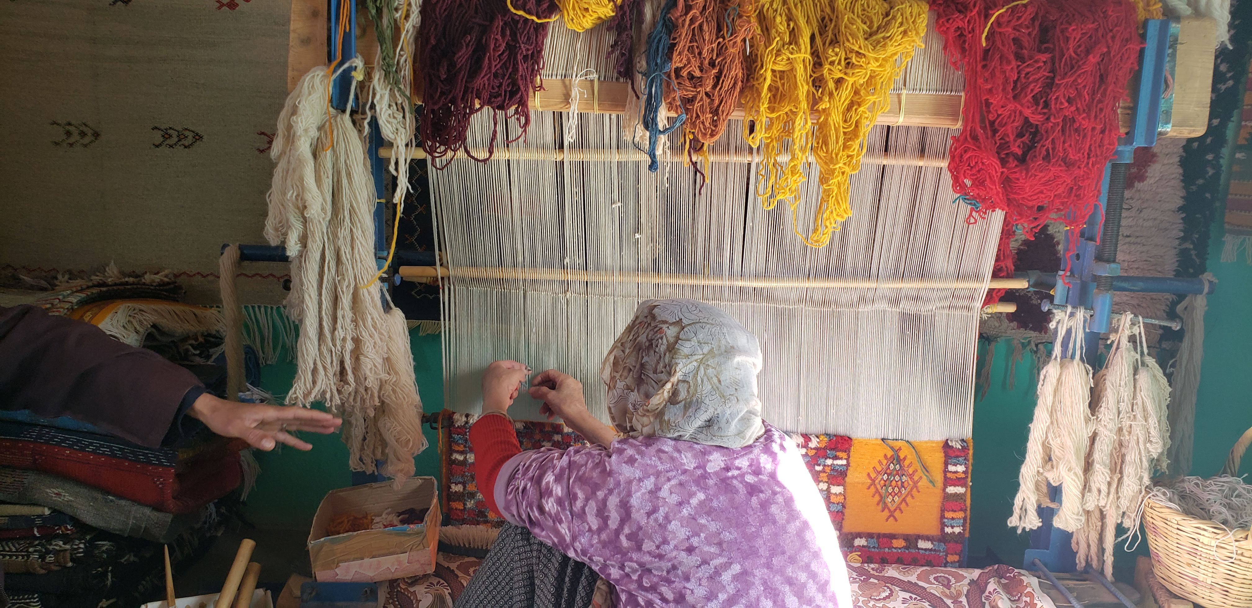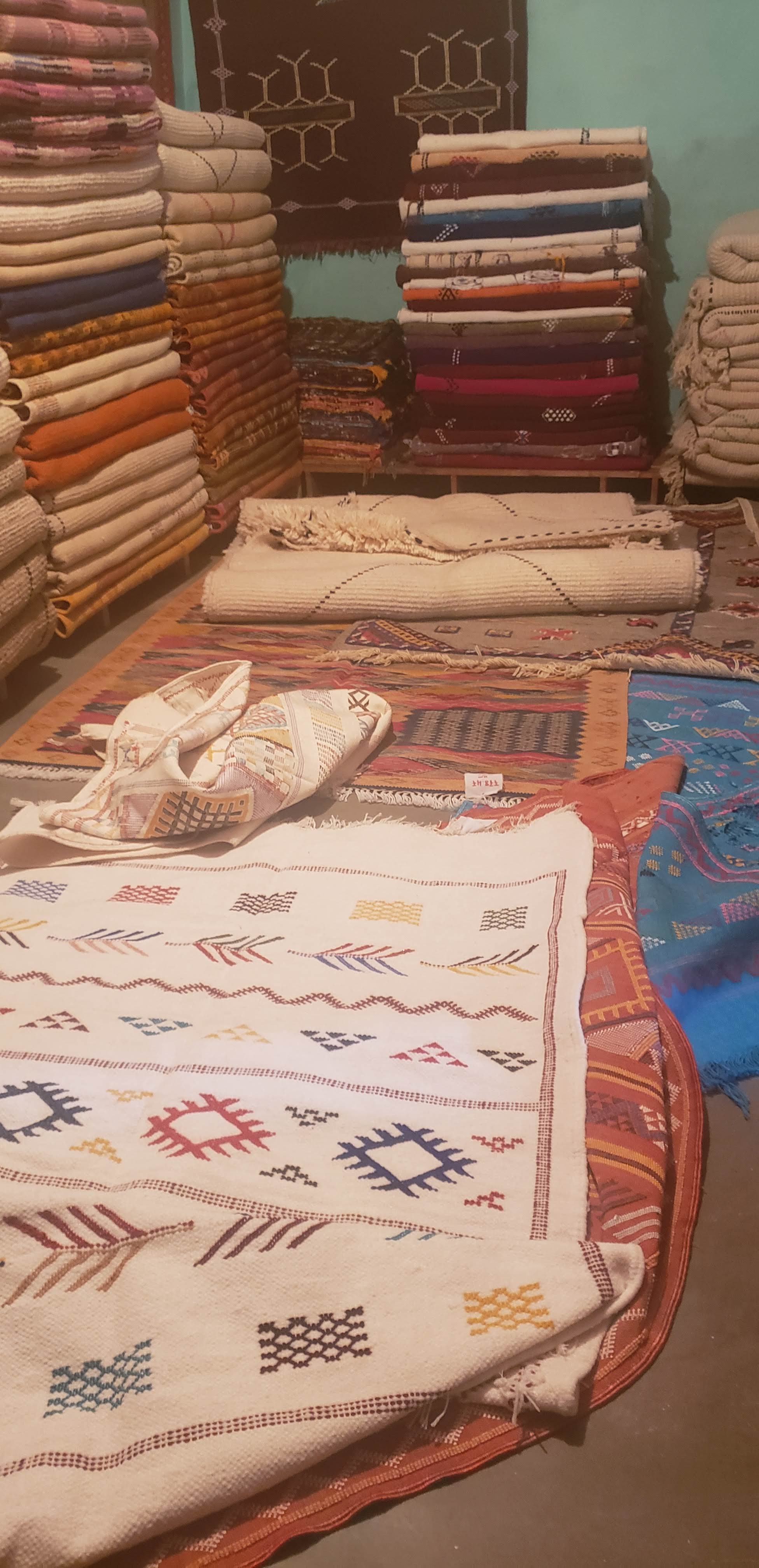 The next day, we were due to head to the Sahara Desert. Along the way, we stopped through the village that is known for making area rugs. It was run by a local cooperative to ensure women in the area that were making area rugs were properly compensated and taken care of. We were shown around the compound and were advised the step by step process to making a beautiful area rug. We watched this sweet old lady show she weaves the beautiful rugs. We then were shown where they dye the yarn and advised how it was all hand dyed using natural materials, such as lavender, indigo, turmeric, etc. It was quite the sight! We were then brought to this room with their finished rugs to have some Mint tea. As I mentioned before, we really planned on not buying anything because we didn’t have any room in our luggage. This was only our first stop! So here I think that this was working out perfectly… until the sales guy looked at Rainier and told us “We could just ship it to the US!” I basically had to drag her out of there before she got any ideas!