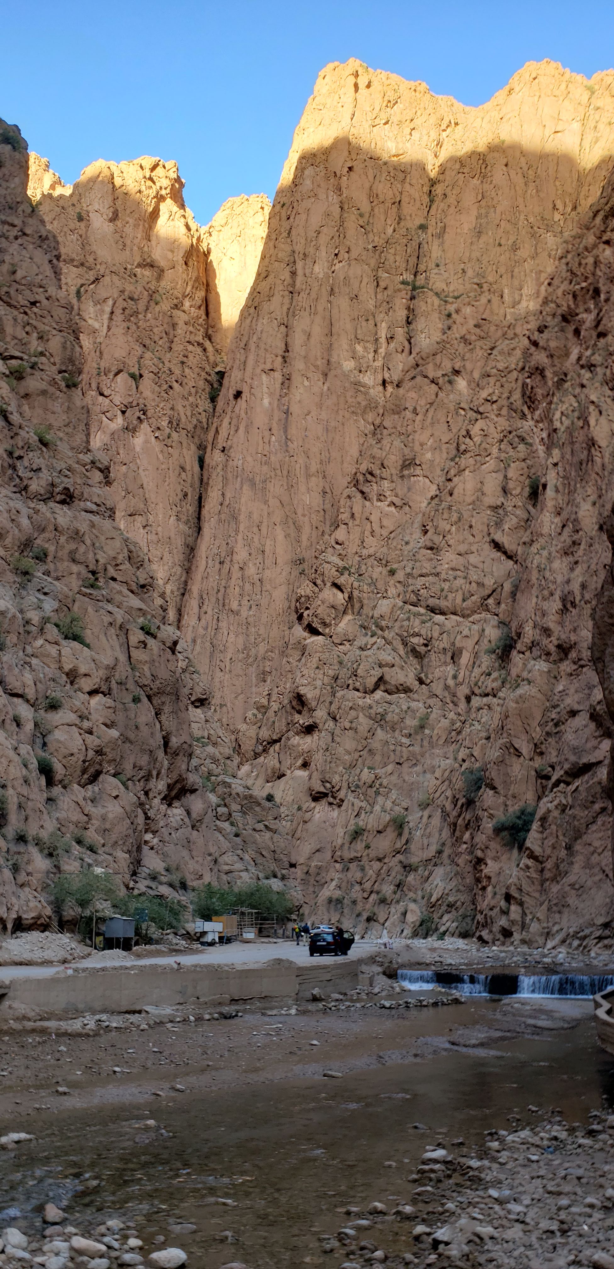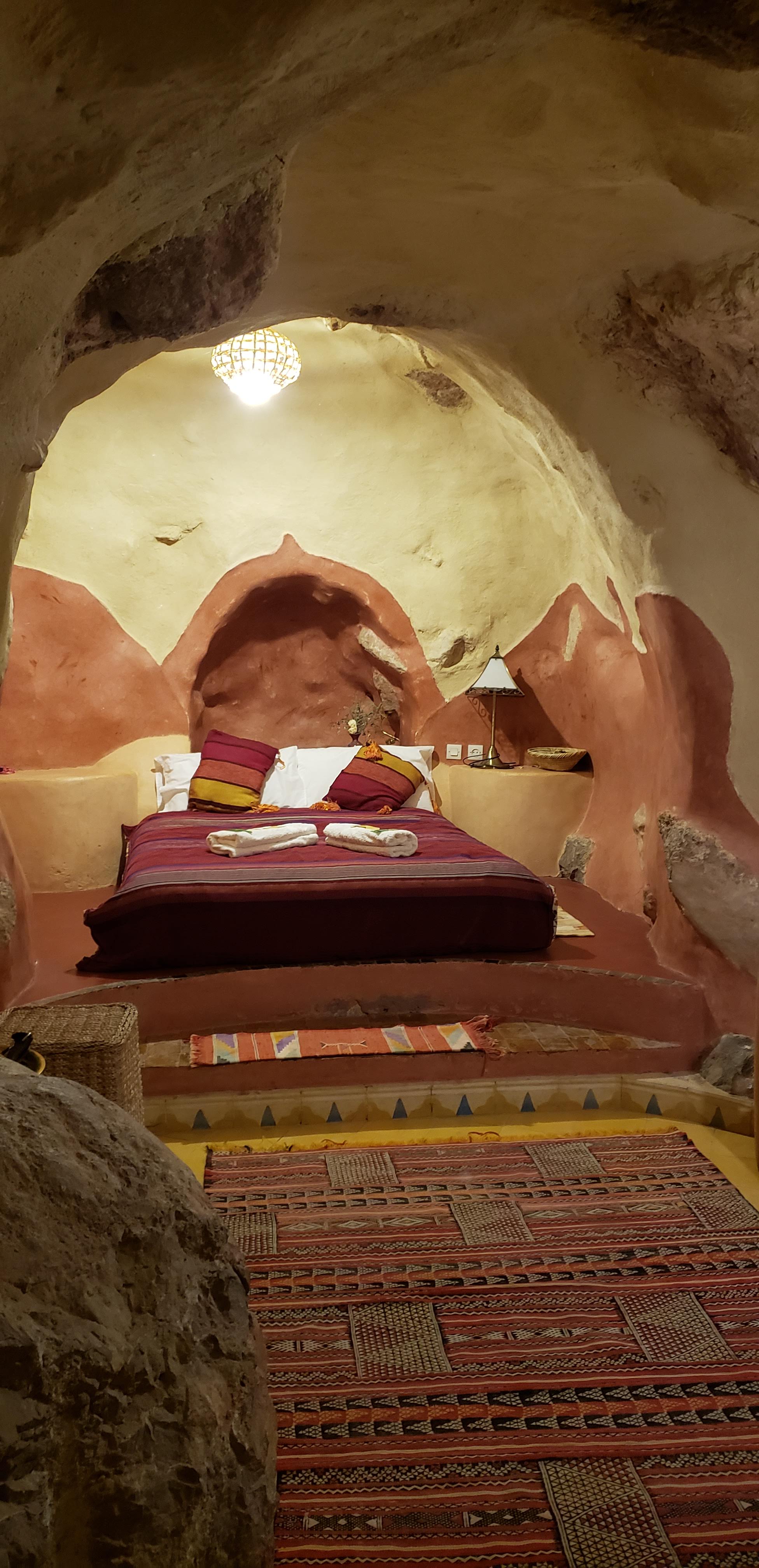 After we left the Pottery town, we headed towards Todra Gorge, where we would be spending the night. It was within a mountain crevasse, but there were houses built along the road, barely on the edge. As we were driving through, you can see rock climbers setting up and climbing the very tall rocks. Apparently this place is known for it’s rock climbing. We stayed the night at Auberge Le Festival. As we were driving up, you can make out this rock/boulder-like castle along the mountain side. This was our hotel for the night! It was very quaint upon entering the reception area. Once we got to our room, it was a cave!