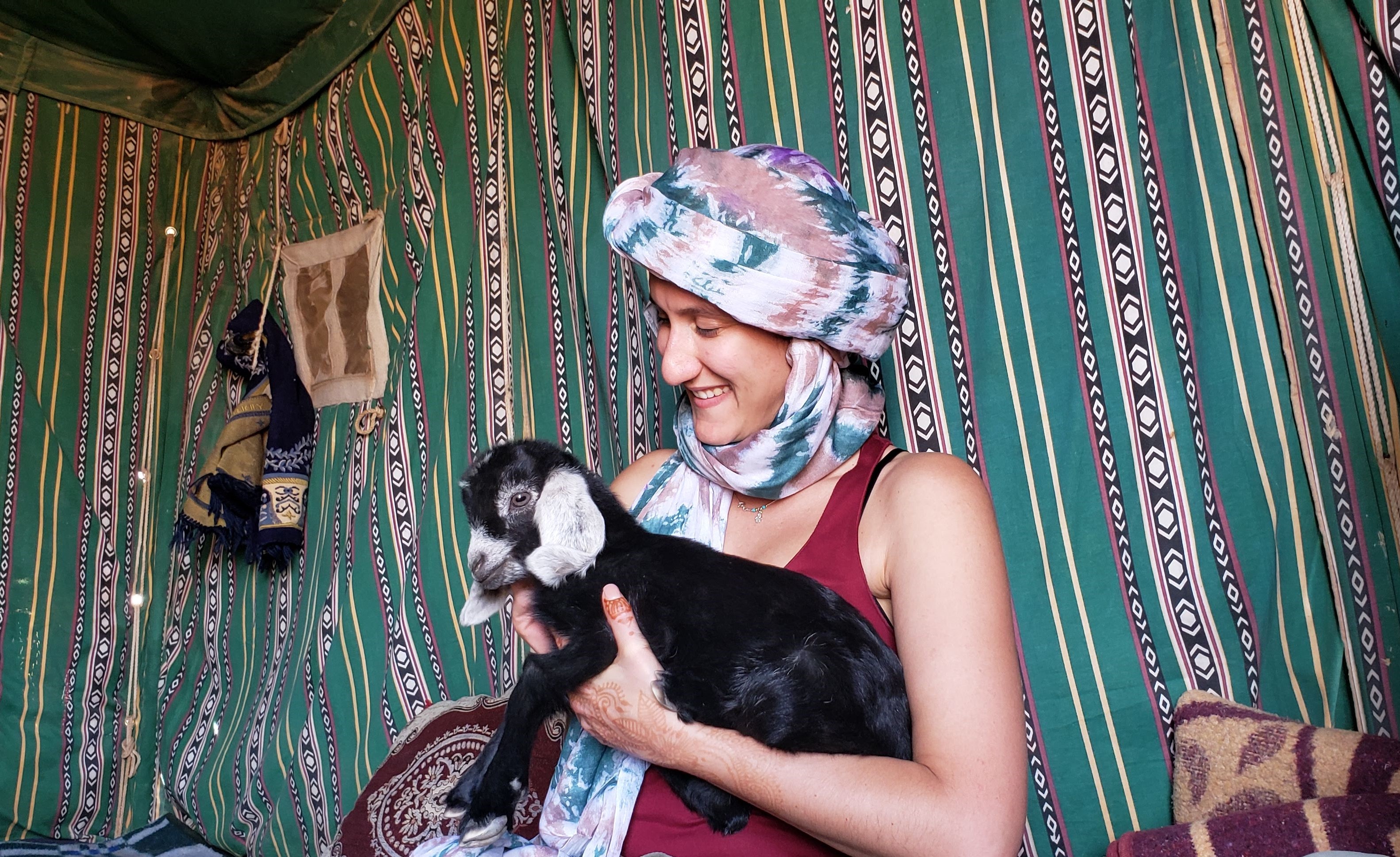 We hiked for about an hour and then the drivers came to pick us up and take us the rest of the way. They took us to the Nomads camp and we learned how they make sand bread – yes you heard me right. They had a baby goat that we all got to play with while escaping the heat and having some Mint tea. After everyone had their fair share of bread and the baby goat, we headed back to camp for lunch.
